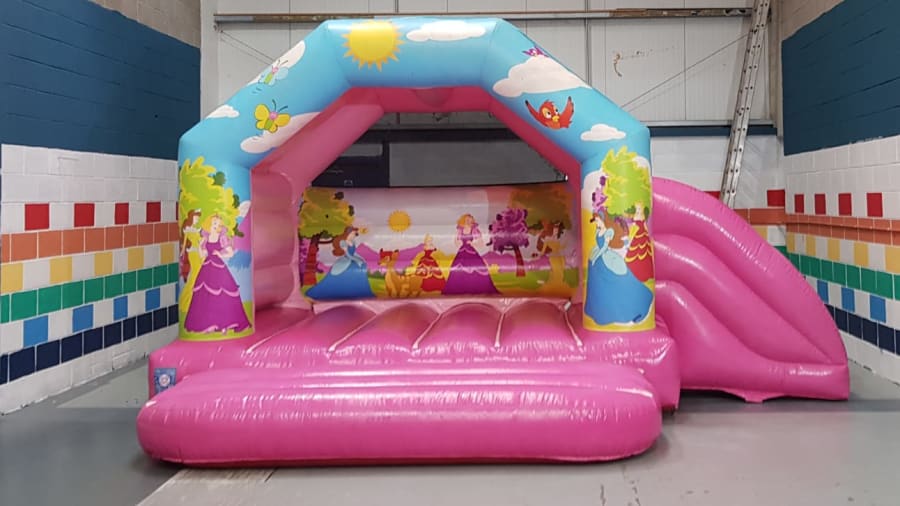 This castle is 17ft x 13ft, this is a brilliant new addition to our range. Our ever popular 15ft x 12ft Pink Princess Bouncy Castle has now got a sister castle with a slide. The side slide is attached to the main bouncy castle bed, with its crisp art work this is an attractive castle.